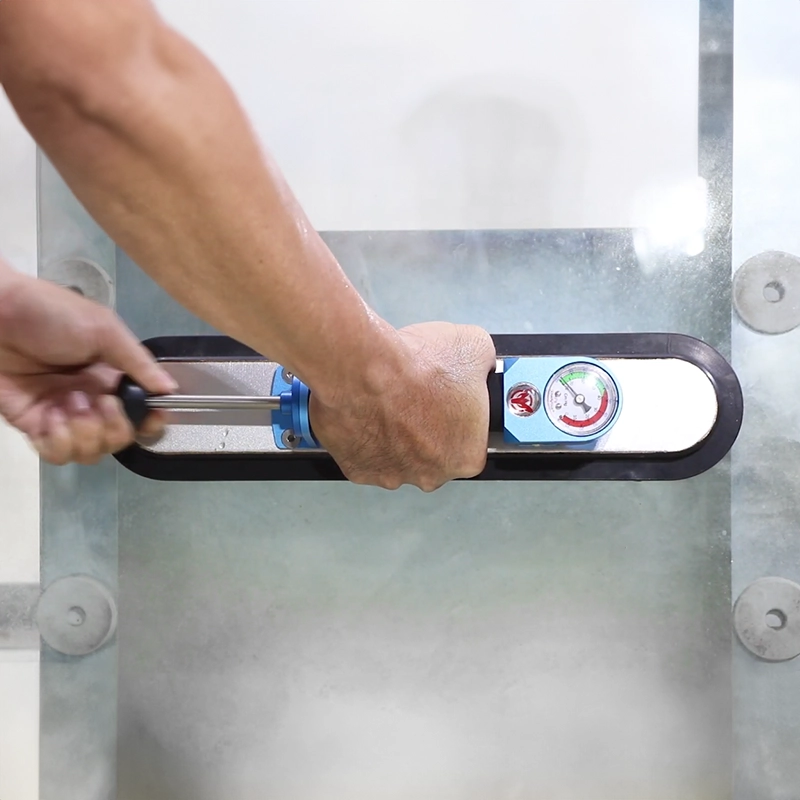 The Oval Hand Vacuum Cup Lifter is made of aluminum with an ergonomic handle, an integrated vacuum gauge, and a pump. It is suitable for non-porous materials with smooth, curved surfaces like glass, stone, and steel pipes. The vacuum is created by pulling the hand pump repeatedly. The vacuum can be continuously monitored via the pressure gauge. Additional pumping can be done at any time.